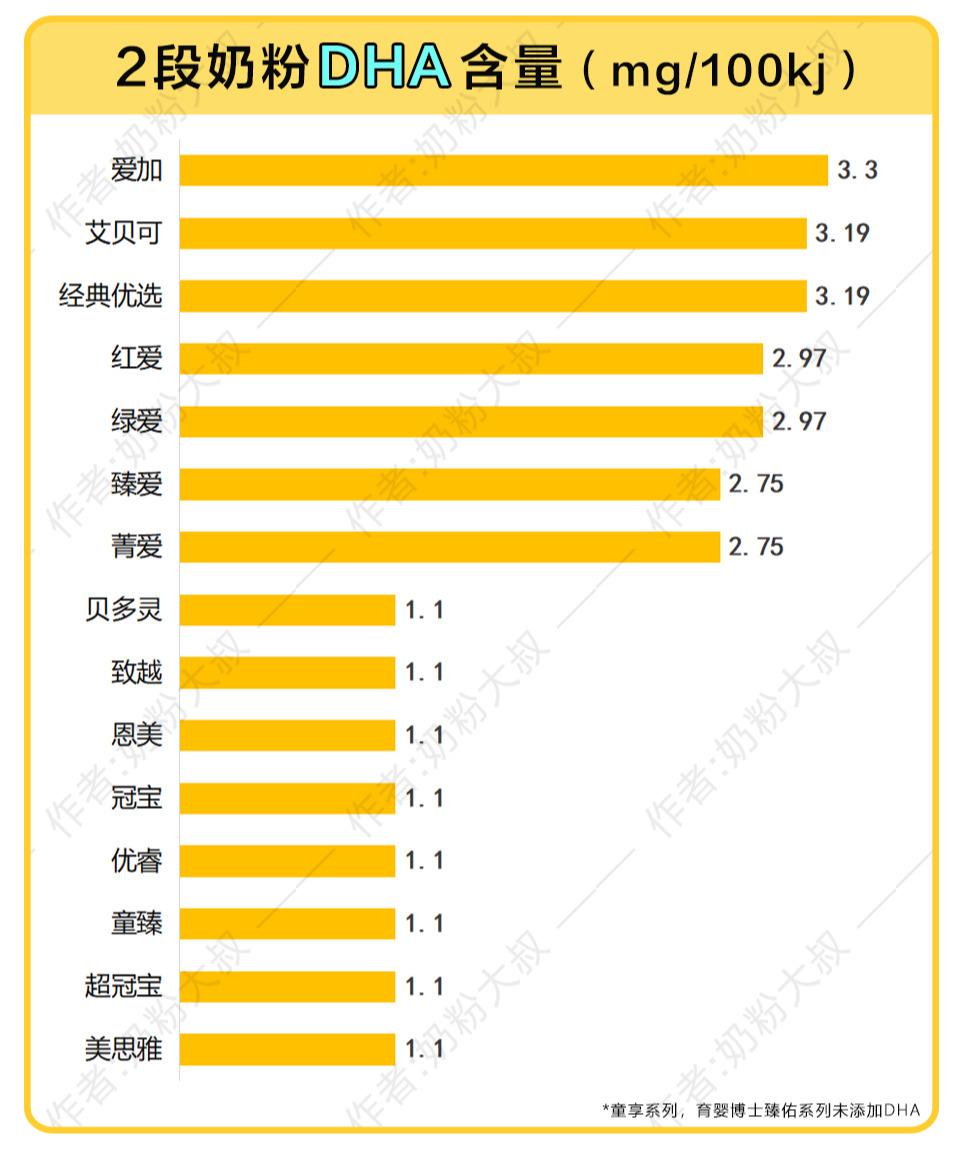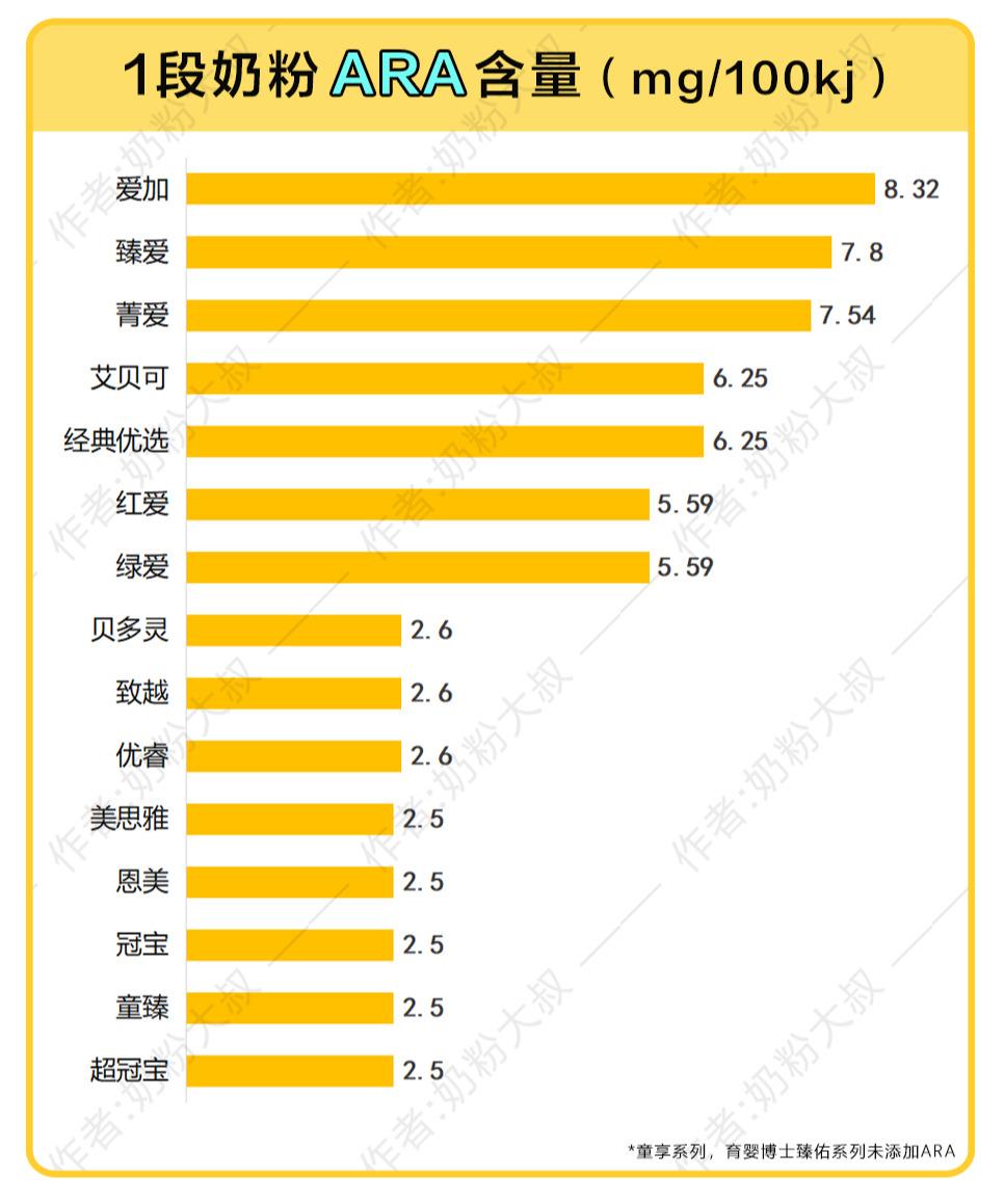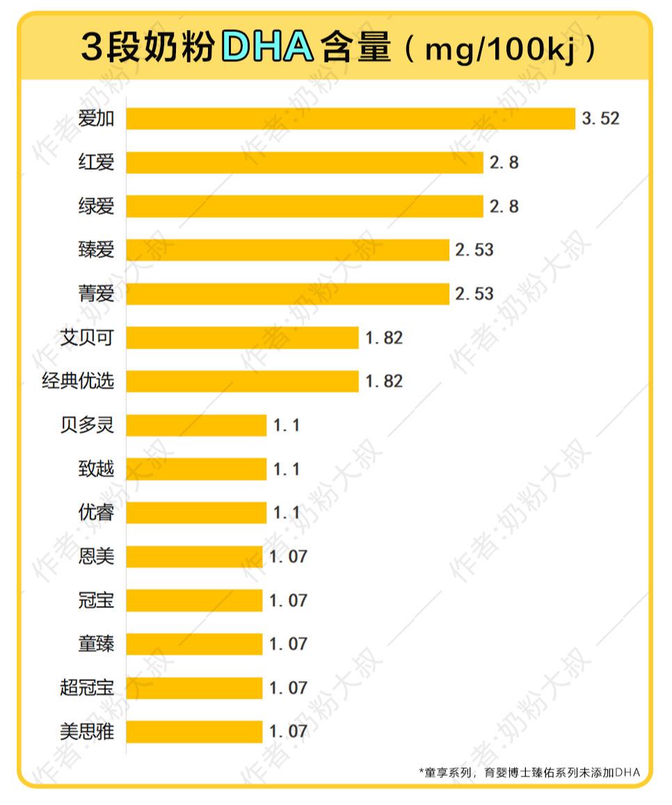 目前市面上超过90%的奶粉都添加了DHA,大部分添加了DHA的配方奶粉都会有ARA。这17个系列3段奶粉中,除了童享3段育婴博士臻佑3段并未添加DHA和ARA,其他系列均添加了,含量也差不多,只有爱加3段DHA含量在市售多数奶粉中排名中上位置,具体含量如下: