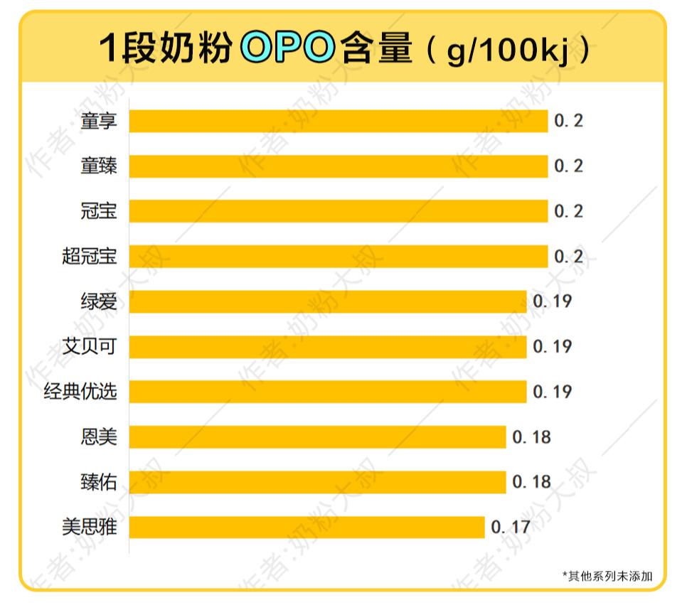 OPO结构脂也叫做1,3-二油酸 2-棕榈酸甘油三酯,如果是容易便秘的宝宝,可以考虑这种配方。市面上所有的1段配方奶粉大约只有1/3添加了OPO。在贝因美的这17个系列的奶粉中,添加了OPO结构脂的配方只有10个,其中,超冠宝1段、冠宝1段、童臻1段、童享1段的含量排在市售多数奶粉里的中上位置。