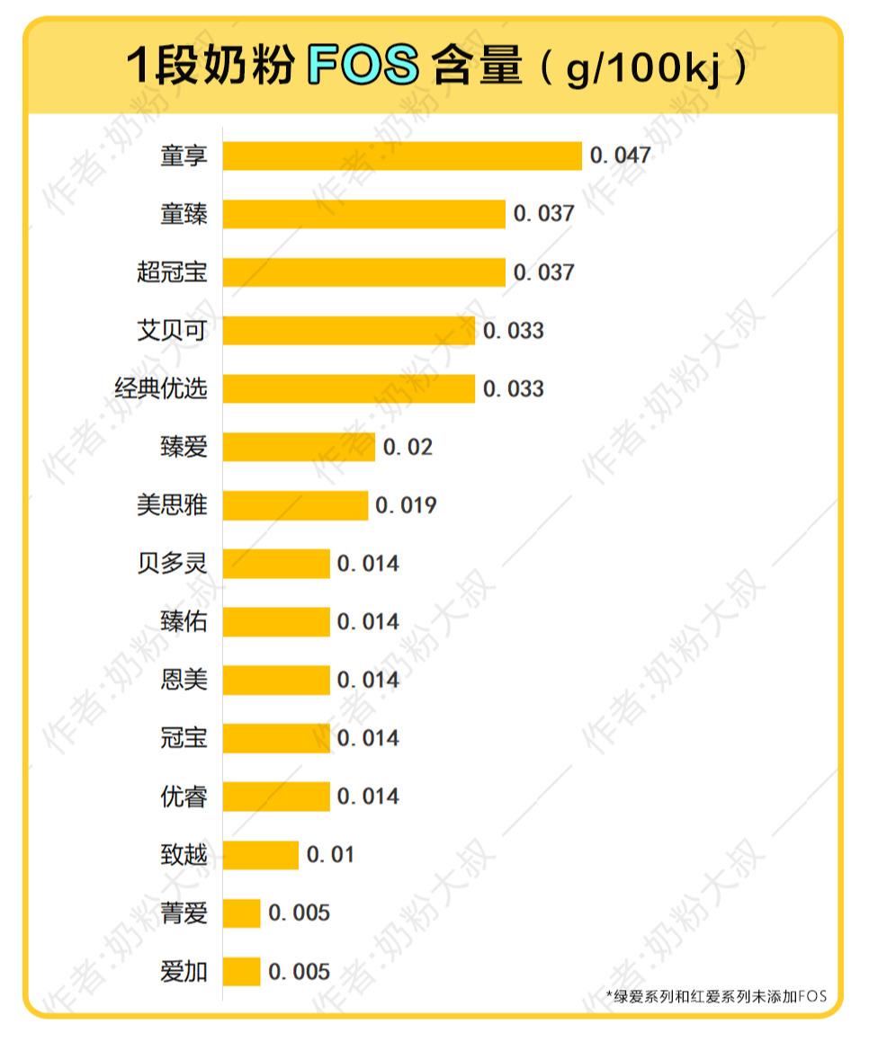 市售奶粉中超过90%都会添加益生元组合(也叫膳食纤维),在本次横评的17个系列奶粉中,有15个系列的1段配方添加了两种益生元,分别是低聚半乳糖GOS和低聚果糖FOS,而绿爱1段和红爱1段只添加了其中1种。总体而言,无论是哪个系列的益生元含量,和市售多数奶粉对比相对普通,具体各系列的添加情况如下: