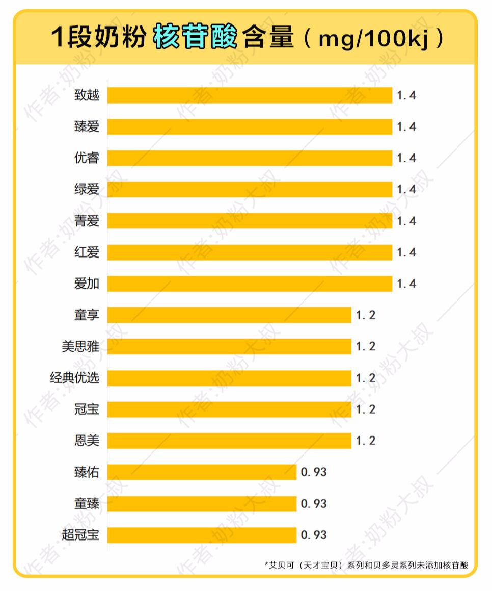 1段配方中,除了艾贝可1段(原名:天才宝贝)贝多灵1段没有添加核苷酸之外,其他全部系列都添加了,但含量各有不同,具体如下: