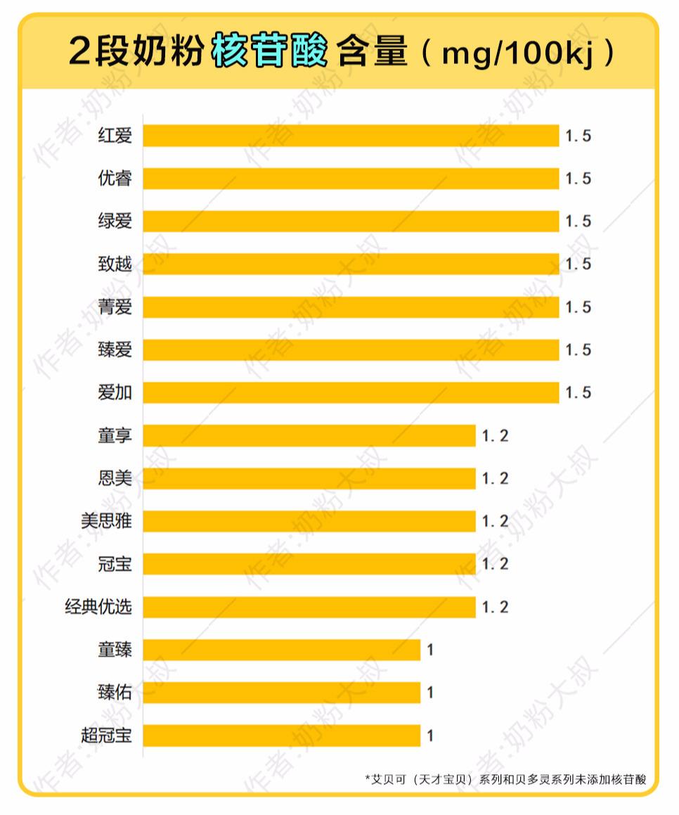 2段配方中,除了艾贝可2段(原名:天才宝贝)贝多灵2段没有添加核苷酸之外,其他全部系列都添加了,但含量各有不同,具体如下: