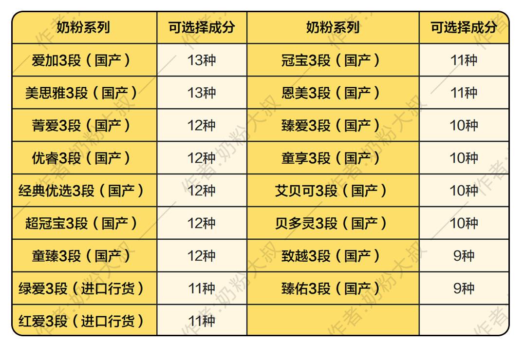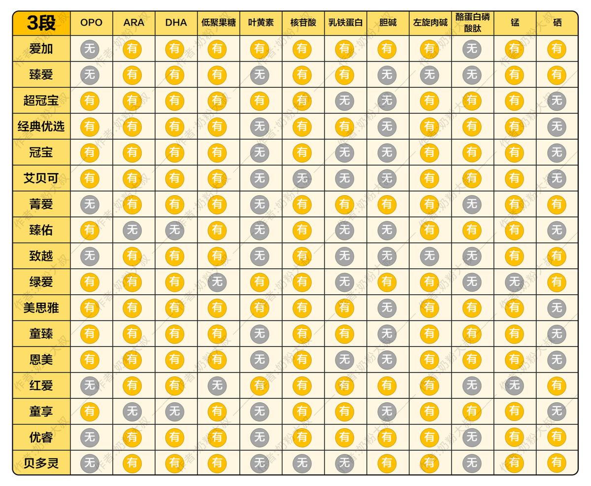 和2段差不多,在可选择营养成分方面,各系列3段奶粉都不同程度添加了9~13种可选择成分,添加种类最多的分别是爱加3段、美思雅3段、菁爱3段、优睿3段、超冠宝3段、童臻3段、经典优选3段。
