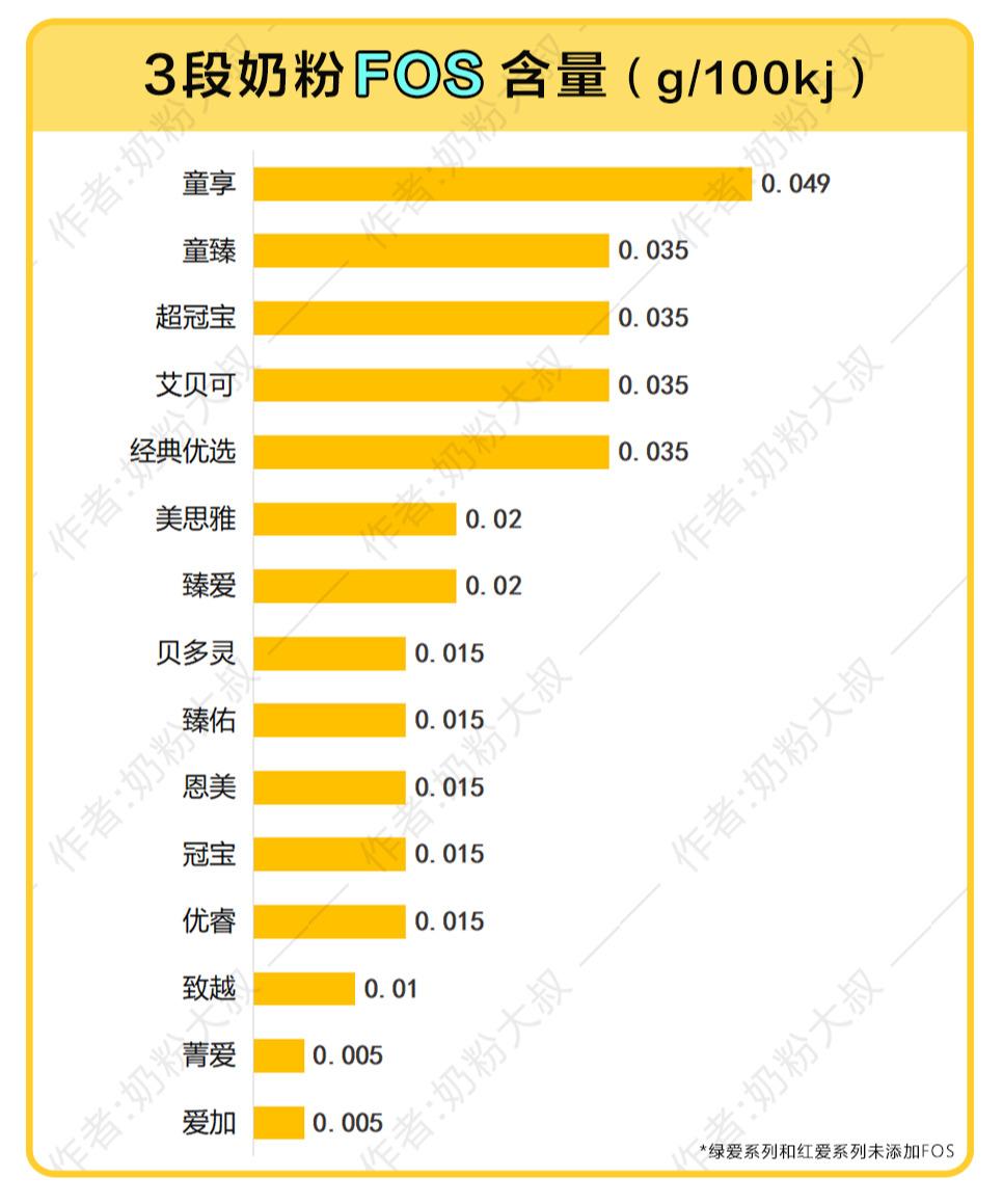 市售奶粉中超过90%都会添加益生元组合(也叫膳食纤维),贝因美各系列奶粉中,有15个系列的2段配方添加了两种益生元,分别是低聚半乳糖GOS和低聚果糖FOS,而绿爱2段和红爱2段只添加了其中1种。总体而言,无论是哪个系列的益生元含量,和市售多数奶粉对比相对普通,具体各系列的添加情况如下: