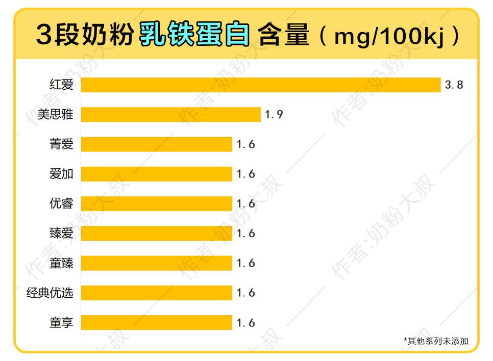 在17个系列的奶粉中,超过一半配方都添加了乳铁蛋白成分,而且添加量排在市售多数奶粉的前列,尤其是红爱3段,含量亦是其他系列的将近2倍,看重乳铁蛋白的可以考虑。
