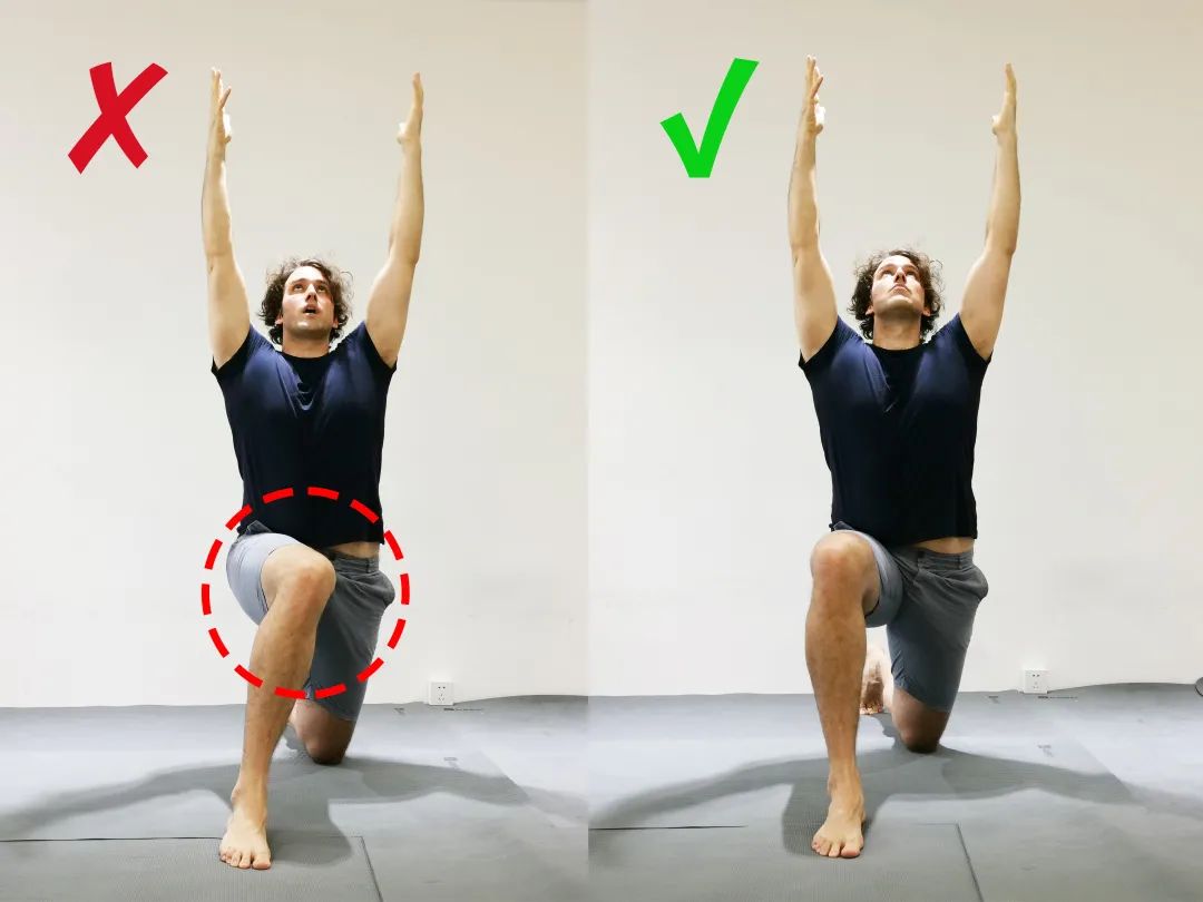 常见错误:臀部肌肉不够用力时,会很容易导致膝盖内塌。需要臀部发力,让前膝保持垂直于前脚掌。