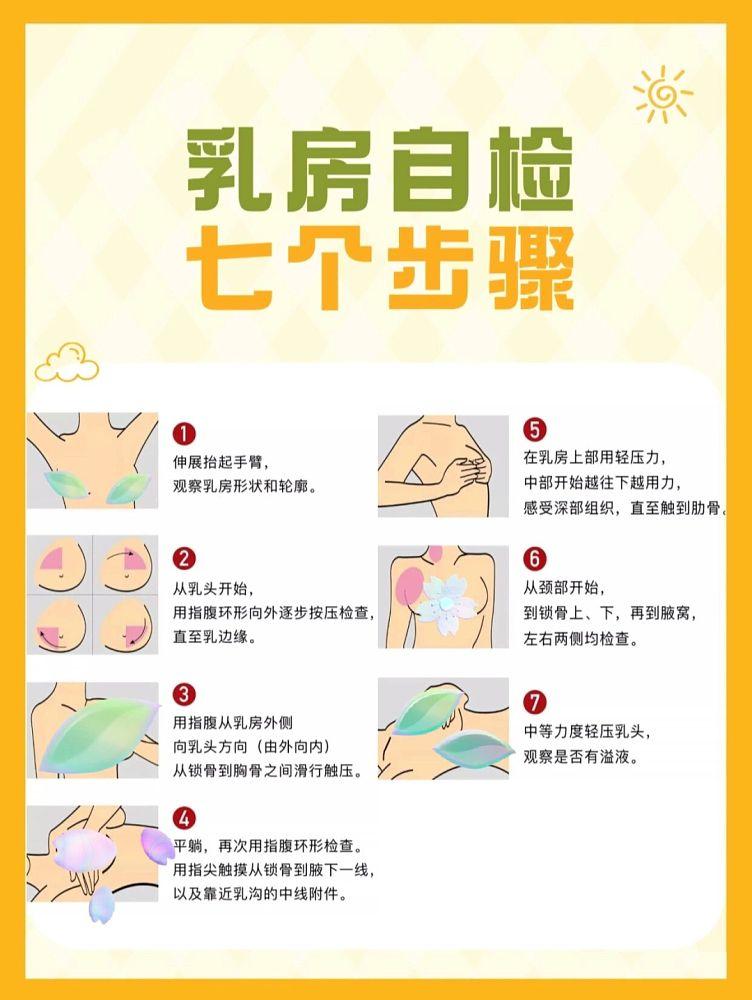每月自我检查可以帮助发现乳头分泌物、乳腺肿块等异常。自检乳房最好在月经后的第7~10天进行,此时乳房较为松软。